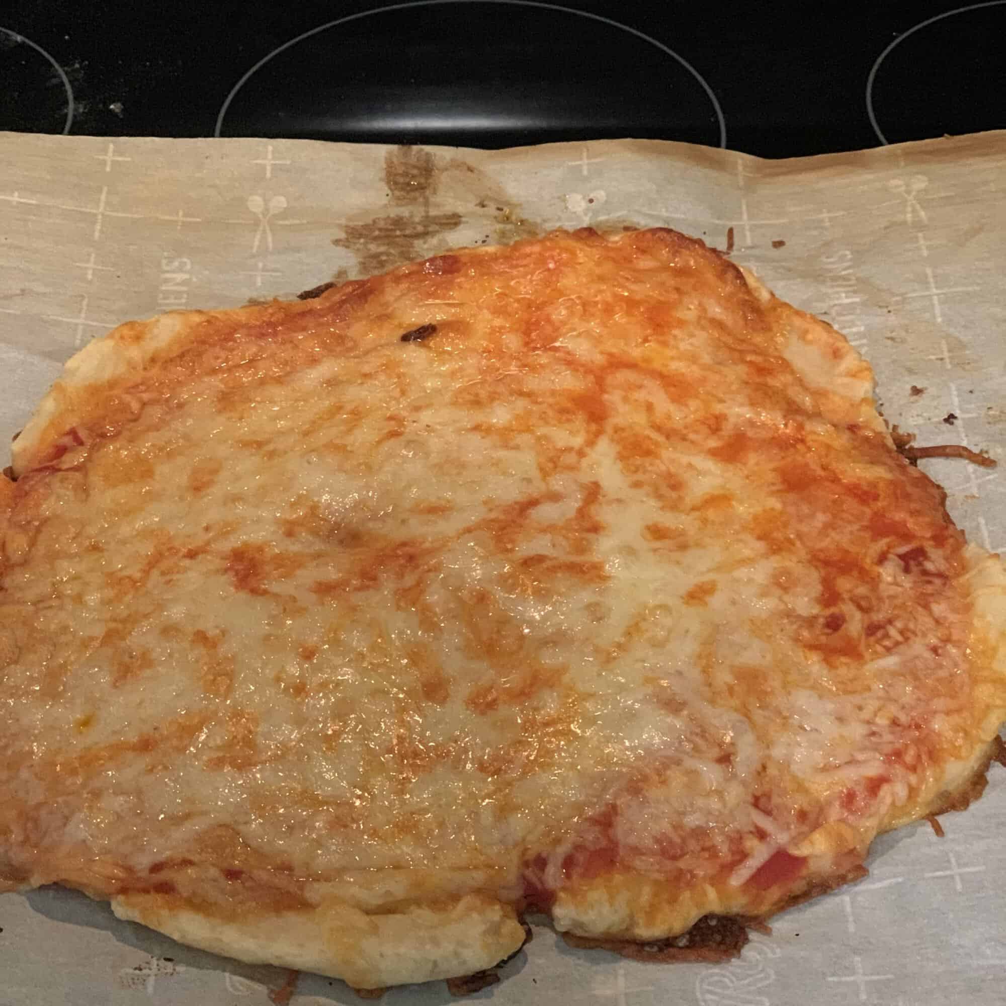- Put your sauce and toppings of your choosing on the pizza and bake till the crust is light golden brown.