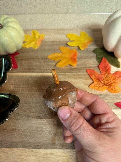 2.Insert pretzel stick. I had to break mine in half so they didn’t poke out the bottom!