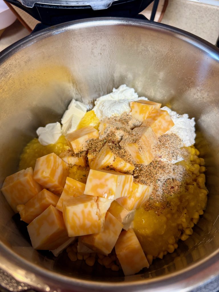 - Drained canned corn. Add to Crockpot/Instant Pot.