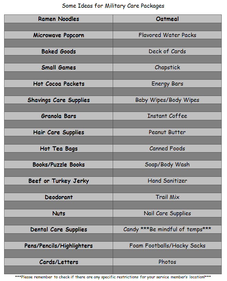 We are now in a technological age where we have so many ways that we can communicate with our spouses even while they are deployed...email, phone, text, face-to-face online chats, and more. Yet, there is one special thing that we can do to stay connected & help your service member stay connected with home as well. That special thing is the Care Package. Those special packages will vary from person to person/family to family based on what the needs & wants are for the service member.