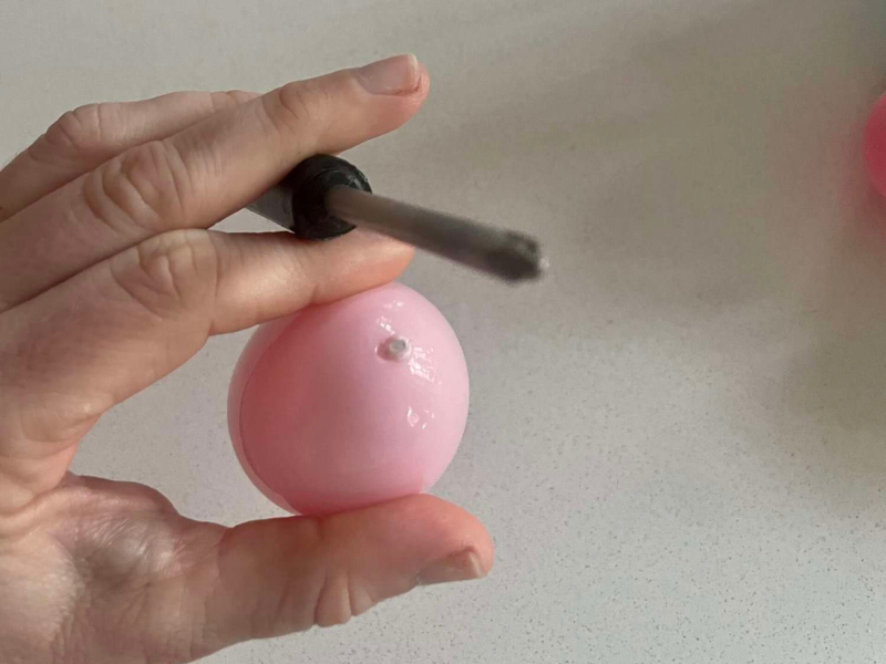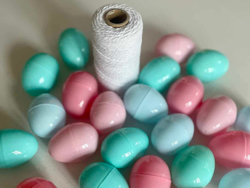 I poke holes on each side of the plastic eggs and thread the twine through them! Repeat until you get to the desired length for your garland.