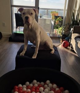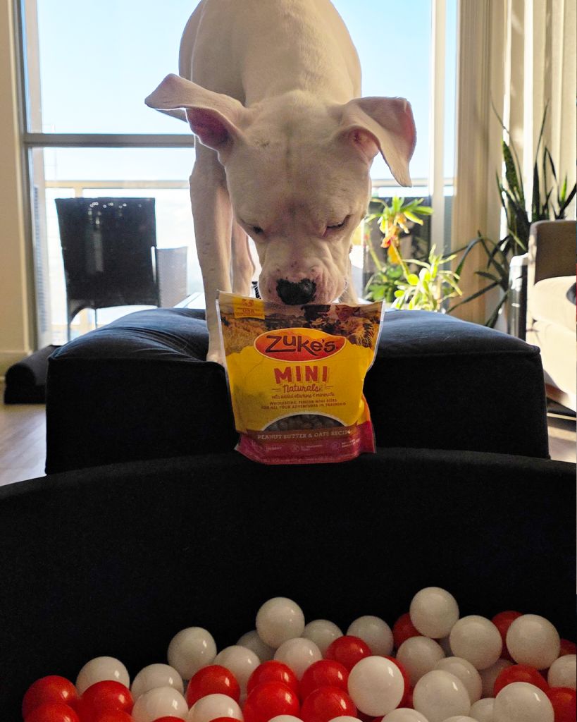 I set up a simple ball pit with red and white plastic balls-because if we’re doing February, we’re doing it on theme. I grabbed a handful of Zuke’s Mini Naturals and tossed them throughout the ball pit, letting them sink between the balls so they couldn’t be found at first glance. The second I stepped back, Zero was all in. Nose working overtime, paws flying, balls bouncing everywhere as the hunt began.