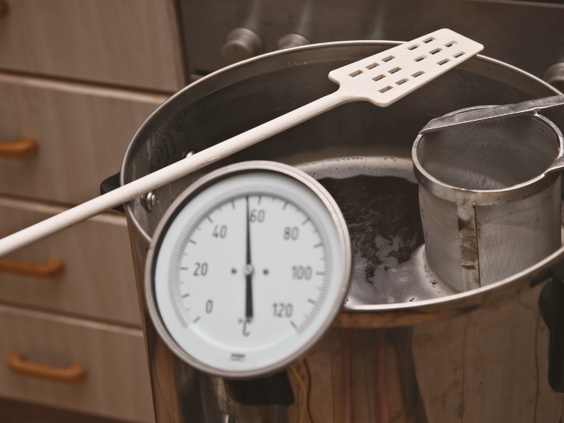 - Add 2 1/2 gallons of water and place the brew pot on the propane burner. Heat to a near boil (160°F). Once the temperature reaches 160°F, turn off the heat and let the grain steep (soak) for 30 minutes.