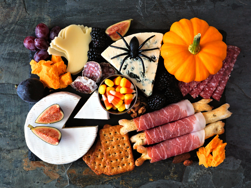 Don't forget to enhance the ghoulish atmosphere with a haunting presentation. Lay down a black tablecloth or use a wooden serving board as your canvas. Add spooky accents like fake spiders, skeleton figures, or creepy crawlies to give your charcuterie board an enticingly macabre feel. Use small pumpkin-carved bowls for dips and eerie mini tombstones for cheese labels.