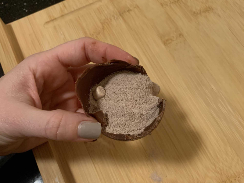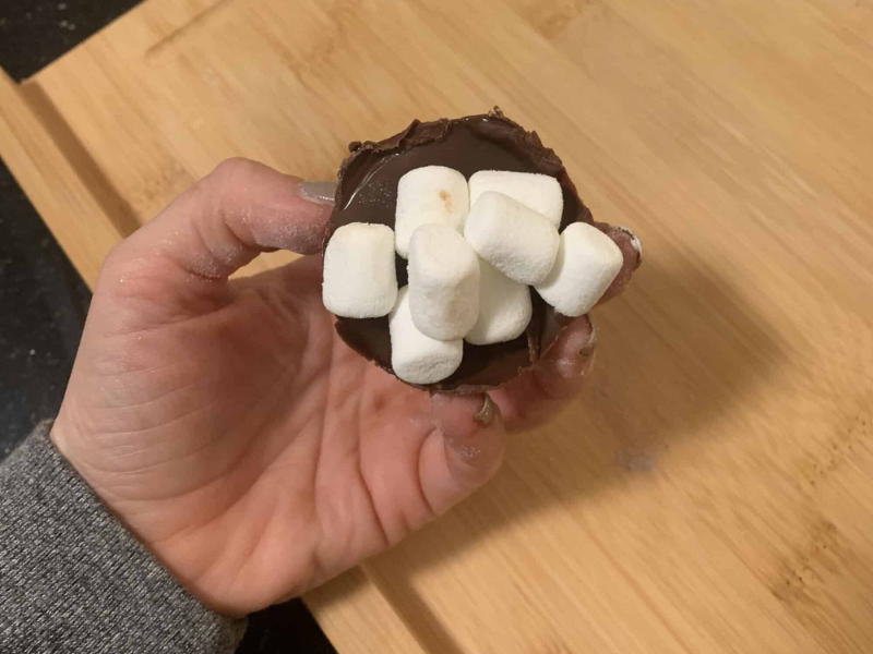 - Even out the sides, pour hot chocolate mix in one side and marshmallows in the other and fuse together...you may need some melted chocolate to glue the sides together.