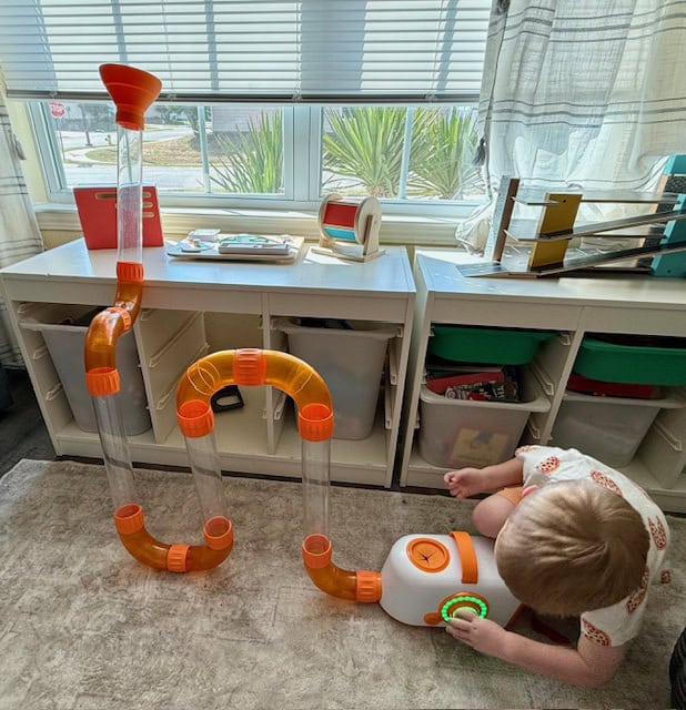 The newest favorite in my home is the Air Toobz from Fat Brain Toys. If you are local to Offutt AFB, near Omaha, Nebraska, and haven't visited this fantastic toy store, you're missing out! Don't worry though! You can snag this on Amazon! This is a little bit of an investment at over $100, but it has rechargeable batteries, and on day one in our home, we charged it three times because my kids would not stop playing with it. This also comes apart to pack up nicely for PCS moves. These are sold out at several stores, but some small shops still have them in stock! We also did invest in the expansion pack for extra fun!