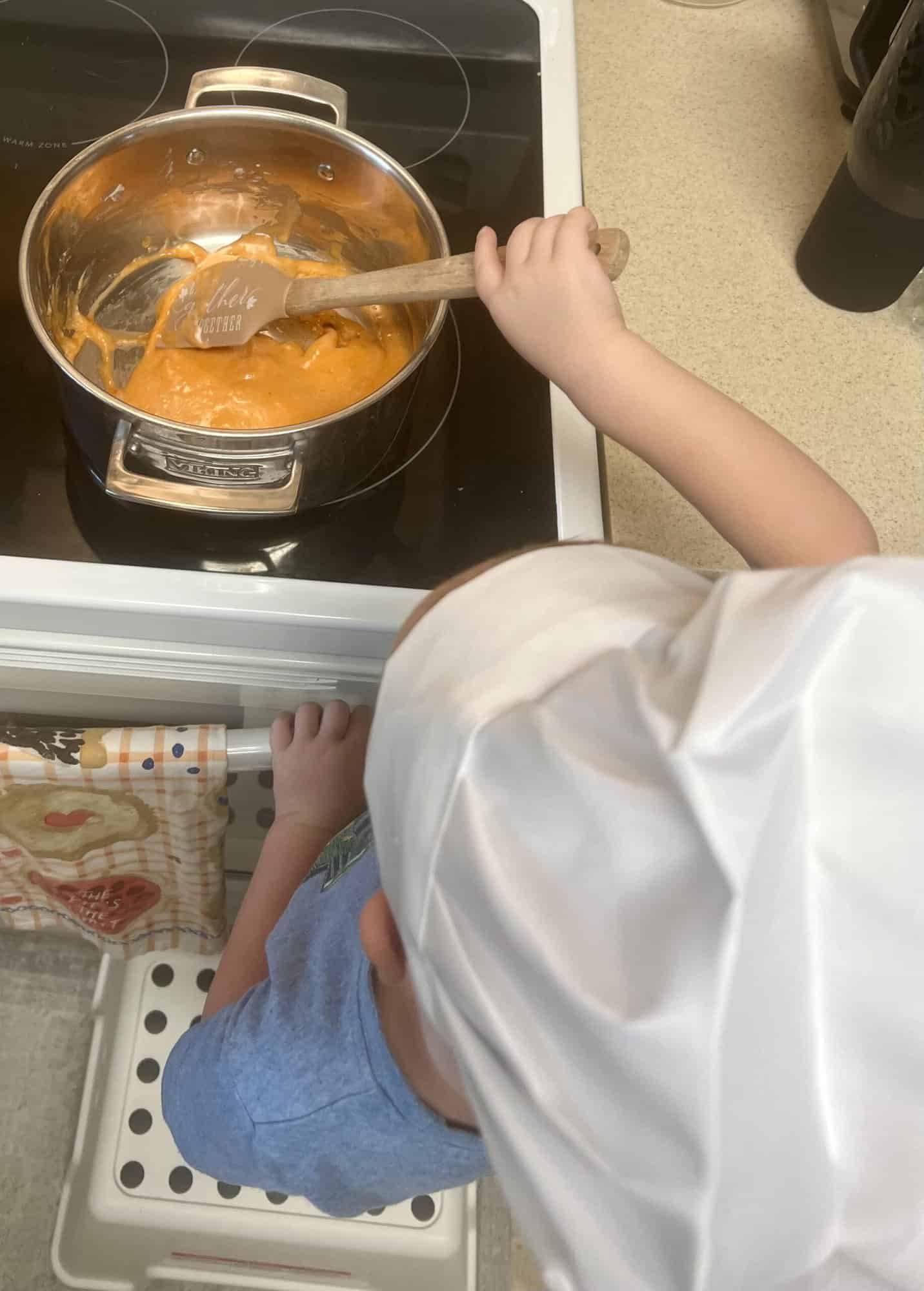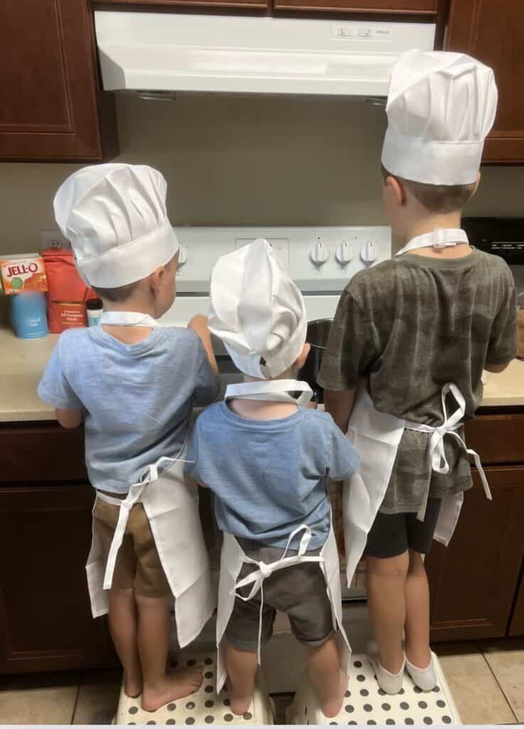 I have 3 kiddos who LOVE being in the kitchen with me! So, I decided to let them do a kitchen takeover! We grabbed our favorite aprons and chef hats and were ready to start concocting some fun! I customized this play dough recipe for my family and it ended up being the perfect amount to make 3 different colors, which was perfect for my three kids.