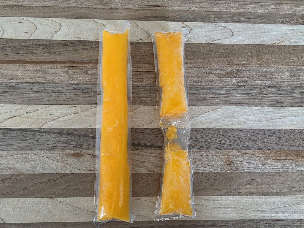 - Once frozen, carefully remove & cut in half without wasting any of the freezer pop!