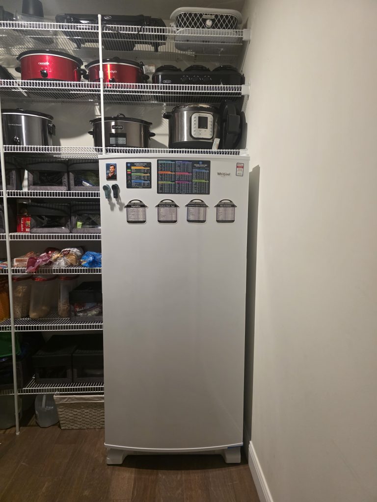 - When we lived on base & also for our first off base house, we had our spare freezer in the garage, which was great for easy access. In our current house, we put our Whirlpool Upright Freezer in our pantry, which is only a few steps from the garage door!
