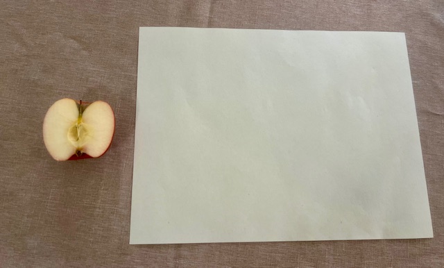 Cut your apple in half and grab a sheet of construction paper. Grab a small plate or paint tray for your paint and dip the half of an apple into the orange paint. You can also paint the apple. I did do a test stamp with the apple to remove excess paint.