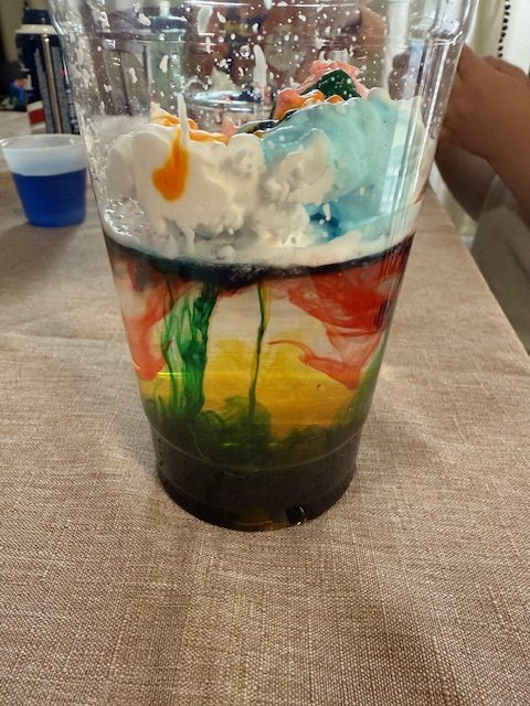 - Depending on the size of your containers you may need more or less Food Coloring. The more concentrated the coloring that faster your rain will come down! Same with the size of your cloud and where you end up dropping your Food Coloring! It was really fun to experiment with using the watered down food Food Coloring versus just dropping the Food Coloring into the clouds. You can really do a lot with this activity!